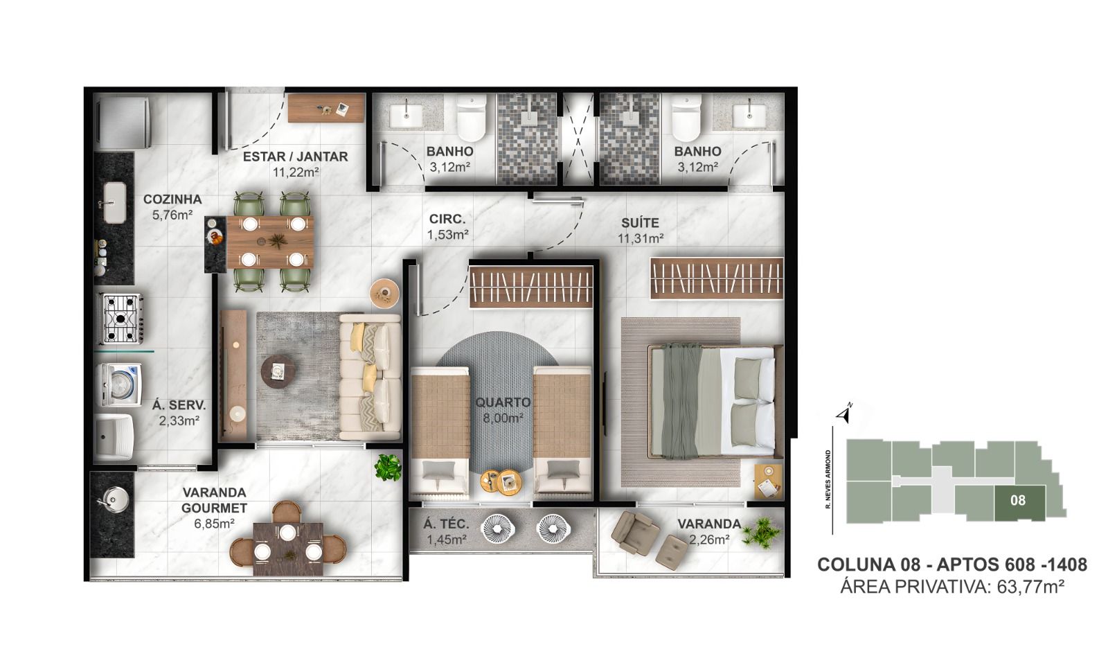 Os studios são ideais para quem busca um espaço prático e funcional, enquanto os apartamentos de 2 quartos proporcionam mais conforto e privacidade para famílias ou casais. Com acabamentos modernos e bem planejados, cada unidade oferece um ambiente acolhedor e versátil para você viver com qualidade.